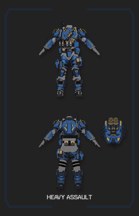 The Heavy Assault class is the first one we focus on. Reasoning for this is that it has the most elements and is the bulkiest one in its role of the front-line soldier, which gives us an opportunity to detract from that design when creating other classes (except Infiltrator). We do this in order to visually tie all of the classes together and optimize development time. As a main unique element, it features an energy generator used to power shields or Nanite Mesh.