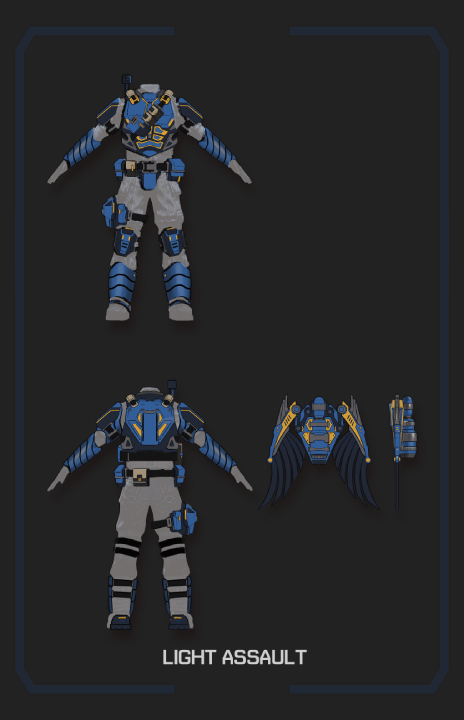 The Light Assault class, in contrast to the Heavy Assault, has its focus on mobility and features less of the protective parts. The patterns reminiscent of those of a crow’s leg skin are more prominent, and its unique element (Jump Jet) is adorned with wings.