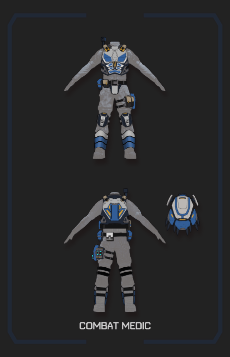 The Combat Medic is the only class that uses white colored elements to establish its purpose, and its unique element is a Medical backpack and holster for the Medical Applicator.