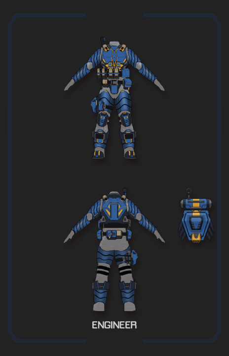 The Engineer class is versatile in both Offensive and Defensive encounters, as such it features more protective elements in comparison to other classes, with only the Heavy Assault topping it. Its unique element is a generator used for powering one of its many available assets at disposal, and calibration tools on the Nano-Armor Kit holster.