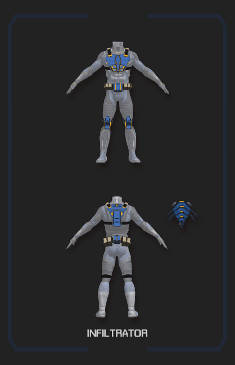 The Infiltrator class, being focused on stealth, has the sleekest silhouette, with a cloaking device as its unique element. This class has a unique body base, which means reusability of elements presented in the Heavy Assault is not a viable option.