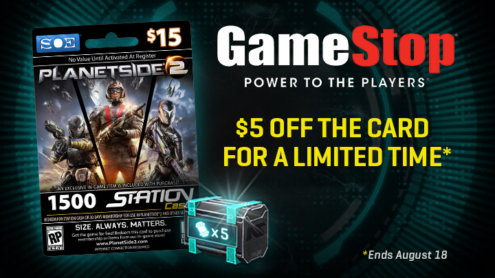Need to bolster your loadout with some new weapons? Perhaps it’s time to make a fashion statement with Giraffe Camo? Gamestop is ready to give you a hand! All PlanetSide 2 Station Cash cards at participating stores now come with a free implant pack! If that wasn’t enough of a deal, from July 28th until August 18th, all cards are $5 off!