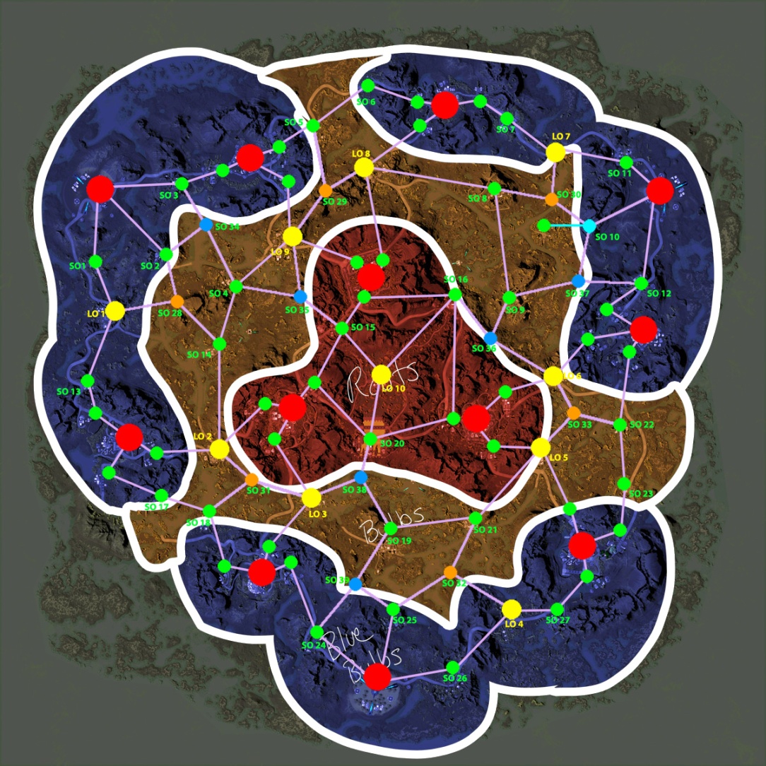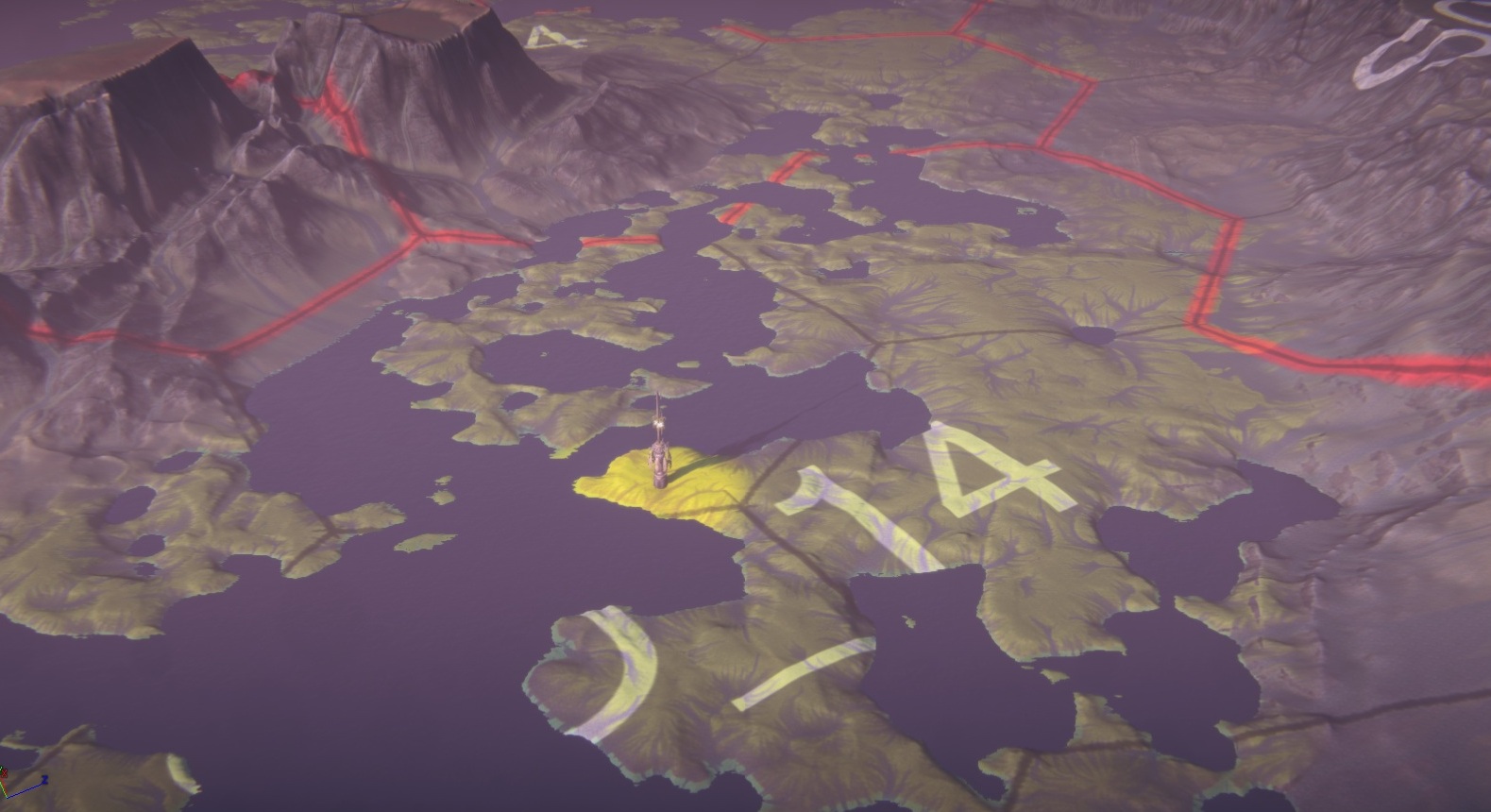 Hossin started with a robust map for continental flow. This was a much more thorough and detailed plan than what was done on the three launch continents. Geography was built around this map to optimize the combat flow and provide occlusion. Here is the map we started with, and that map overlaid with the launch map of Hossin.