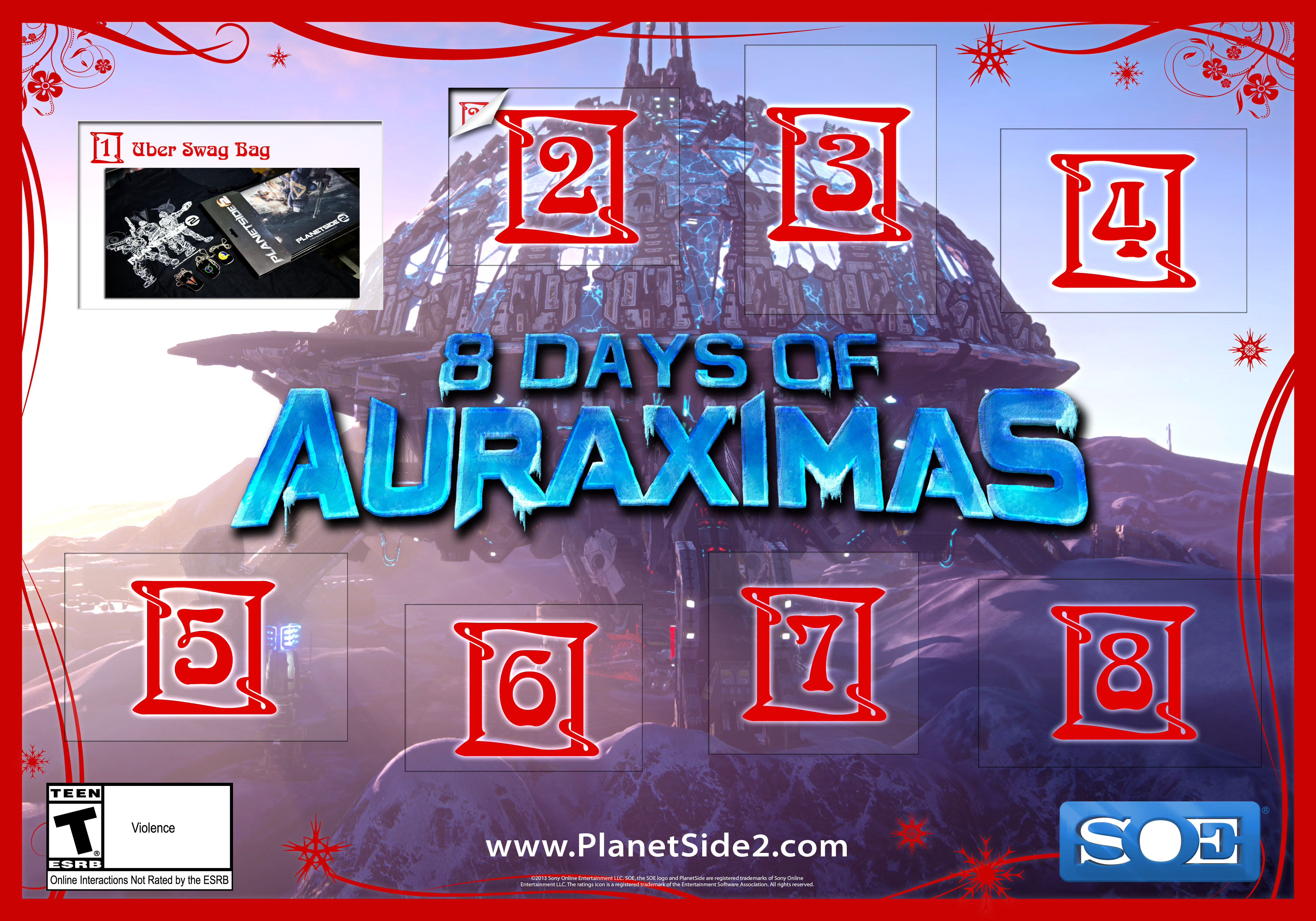 Today we’d like to announce the start of 8 Days of Auraximas! Each day we’ll be releasing a new giveaway that you and your fellow outfit mates can take part in! As the days progress, you’ll have a chance to win more rewards!
