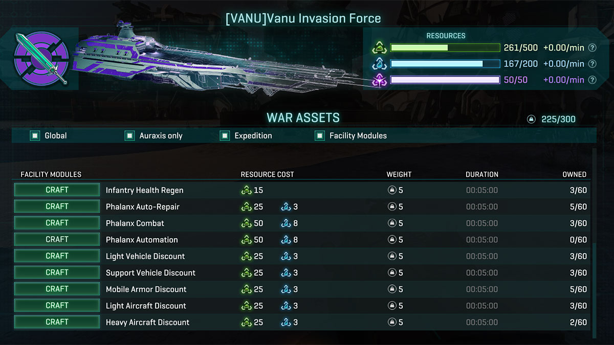 We will continue to expand and modify available War Assets and Facility Modules with future updates.