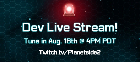 The livestream begins at 4:00PM PT on Wednesday, August 16, 2017, over on www.twitch.tv/planetside2. We'll see you there!