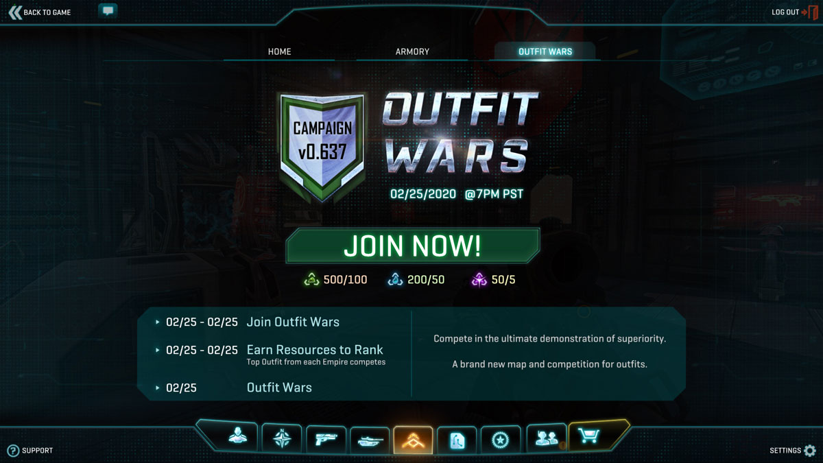 Outfits can choose to opt-in starting Friday via the new Outfit Wars tab in-game* (*note: dates/resource costs below are Test server values and don't reflect what's currently on Live servers - see the full schedule below):