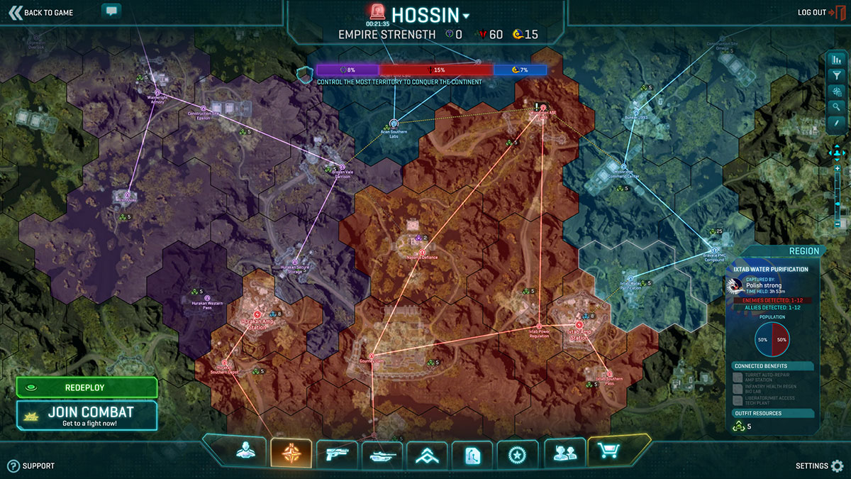 War Assets require crafting time and new resources, which can be accrued by participating in normal Outfit operations. Outfits can earn 3 new resource types - Auraxium (green), Synthium (blue), and Polystellarite (purple) - by capturing and controlling territory in the main game. Each region's resource value is now displayed on the continental map: