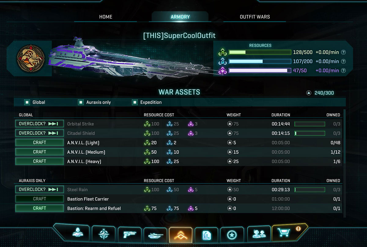 War Assets offer Outfits of every size and competitive level new tactical options and variety as they work together to accomplish strategic objectives in service of their Empire. War Assets can crafted from the new Outfit Armory tab using new resource types your Outfit can accrue through territory capture and control within the main game: