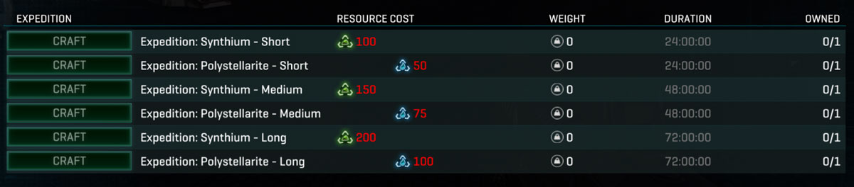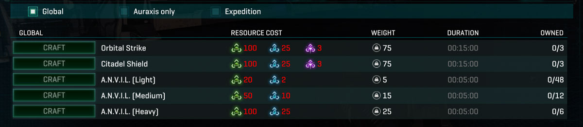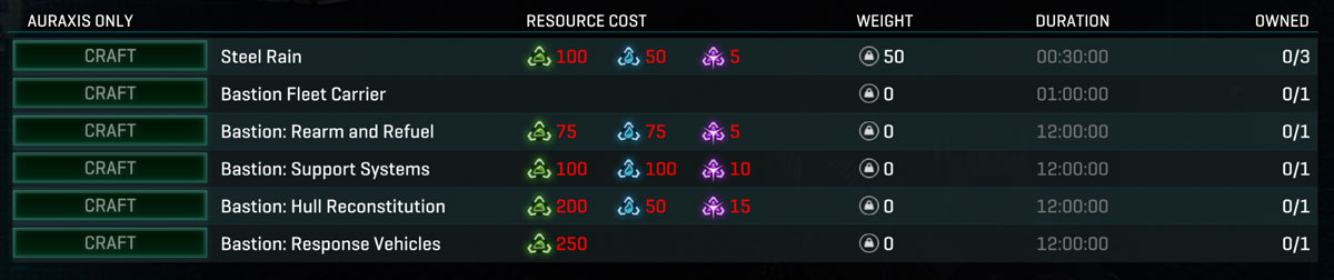 Each new resource type also has a rarity to it - Auraxium (green) is the most common, and can be spent on Outfit Expeditions to acquire more Synthium (blue), which can in turn be spent to acquire Polystellarite (purple). Those rarer and more valuable resources are particularly valuable when it comes to crafting your Outfit's very own Bastion Fleet Carrier!