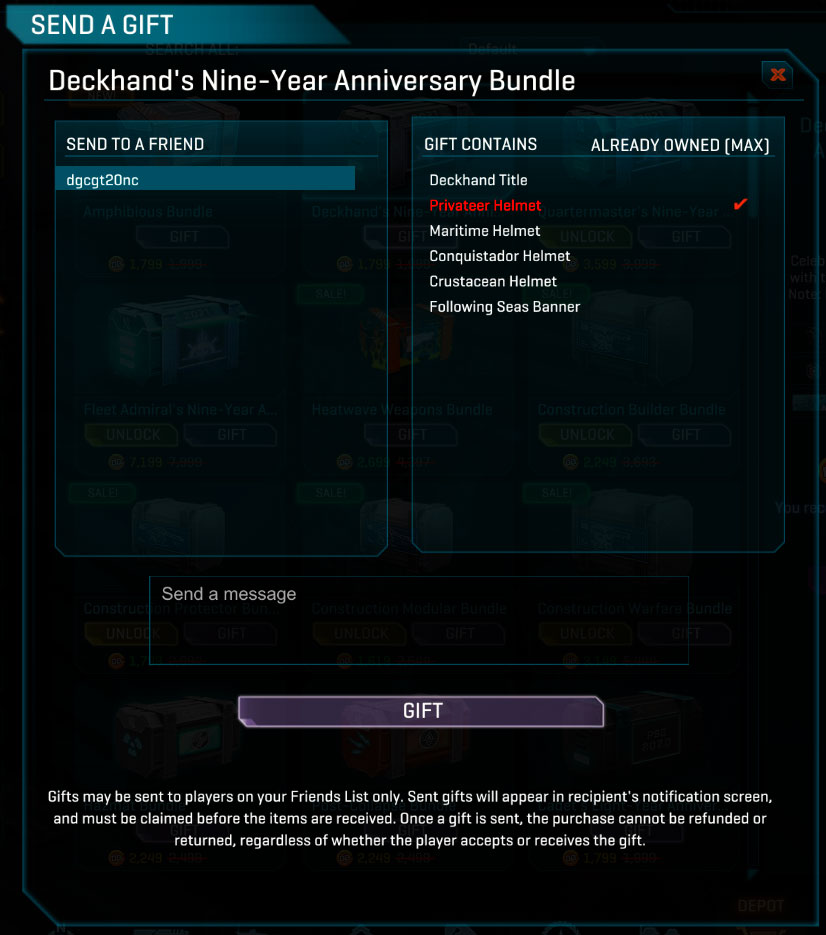 You will now be able to share the fun with your friends through item gifting! Depot items now have a "Gift" option that allows you purchase depot items for someone on your friend's list.