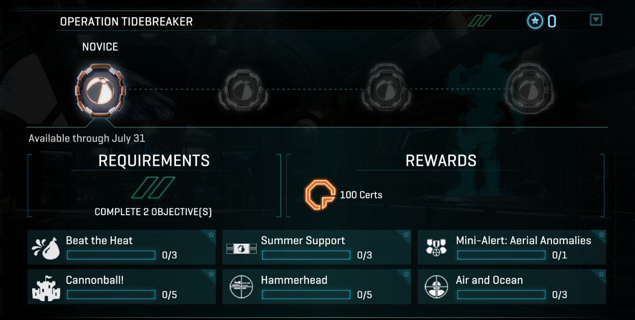 Summer is here and it's time to play in the sun! Enjoy summer time activities with the new Operation Tidebreaker directive and Corsair / Harasser Lumifiber reward cosmetics! The new Ares helmet, and Surfbreaker and Surfcutter vehicle platings are also available in the depot.